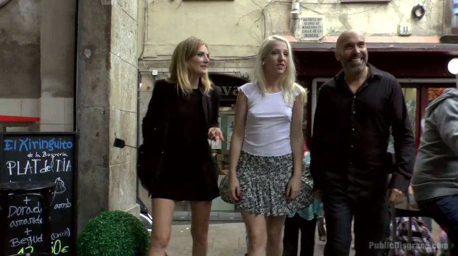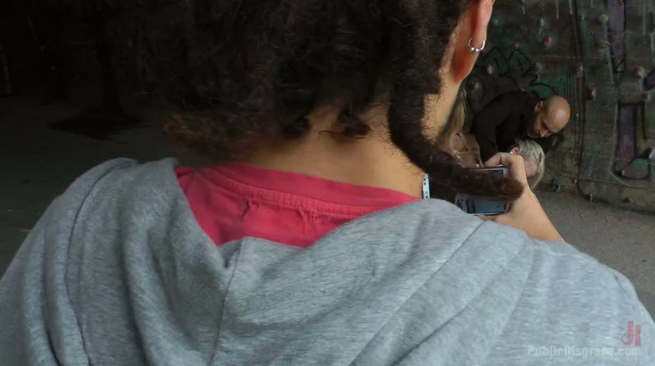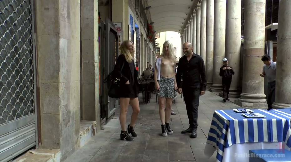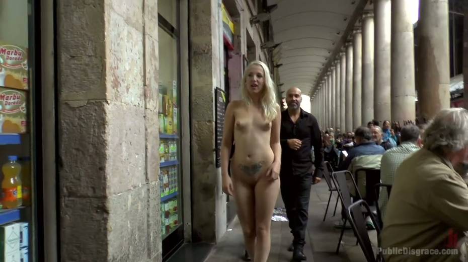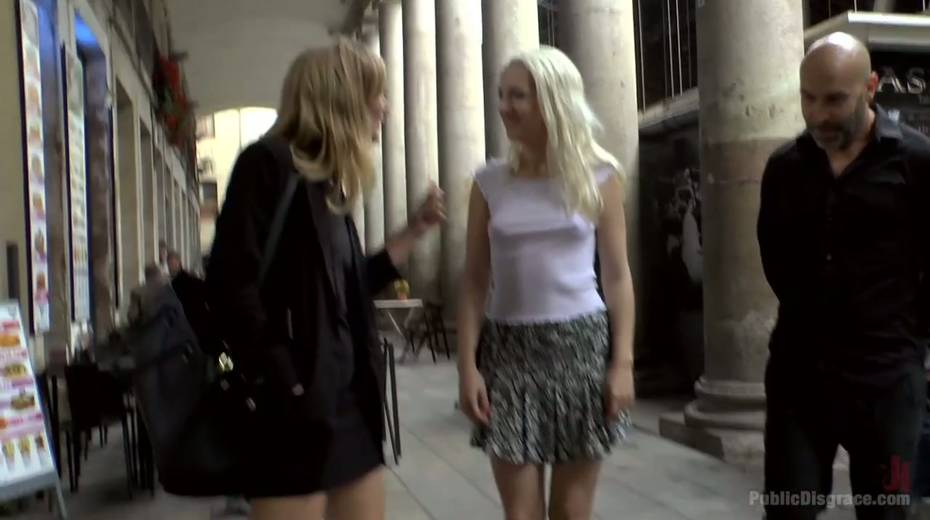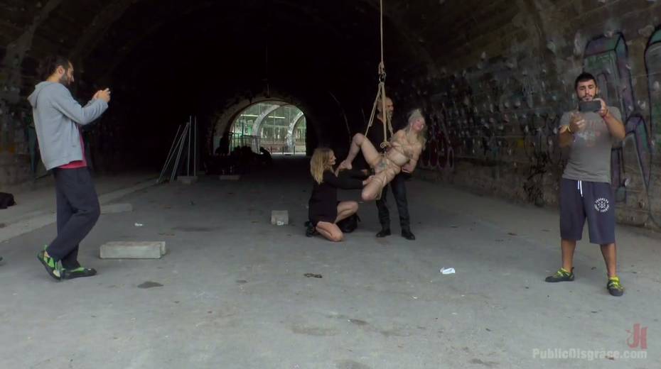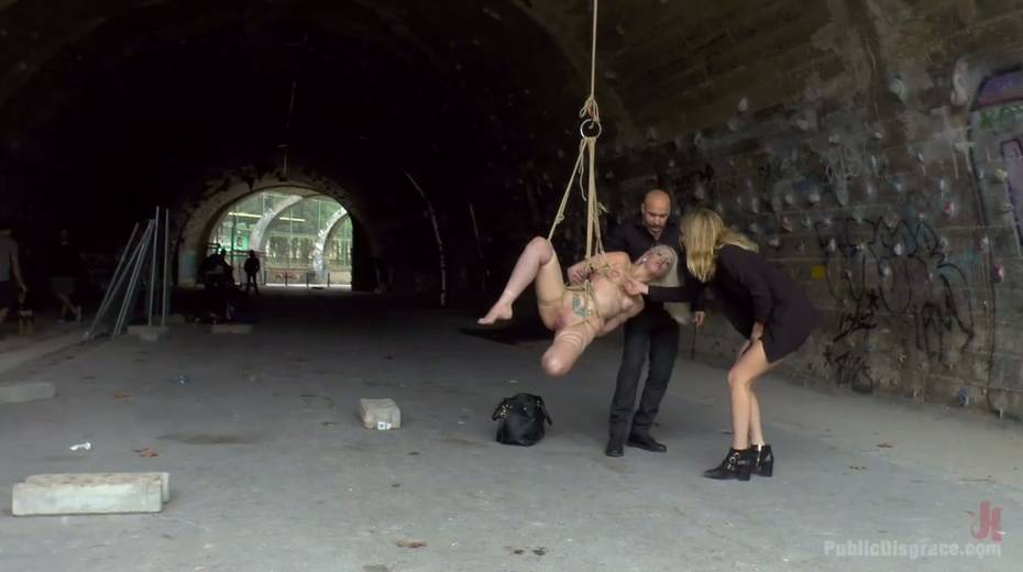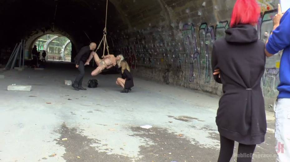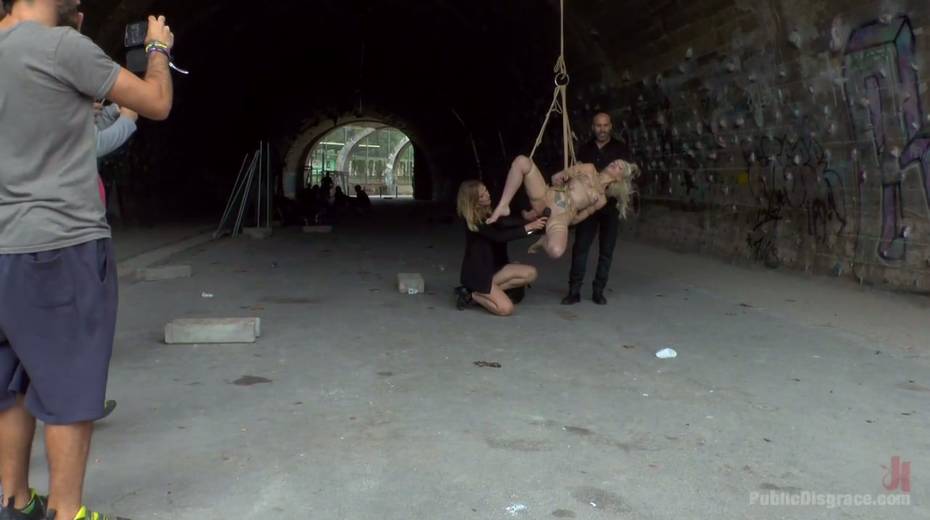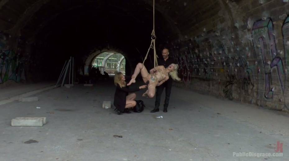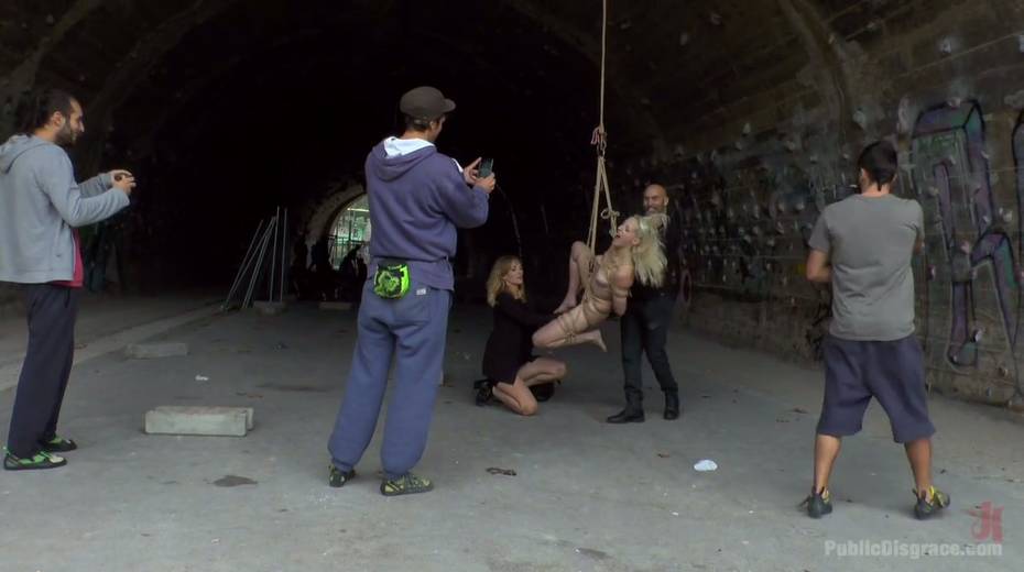 Slender blonde Liz Rainbow is tied up and punished in public