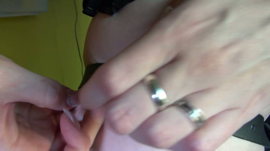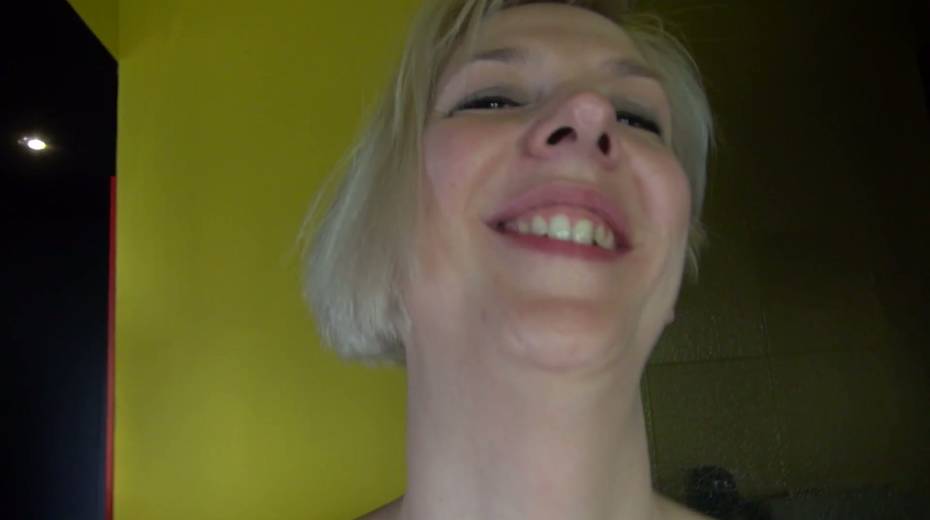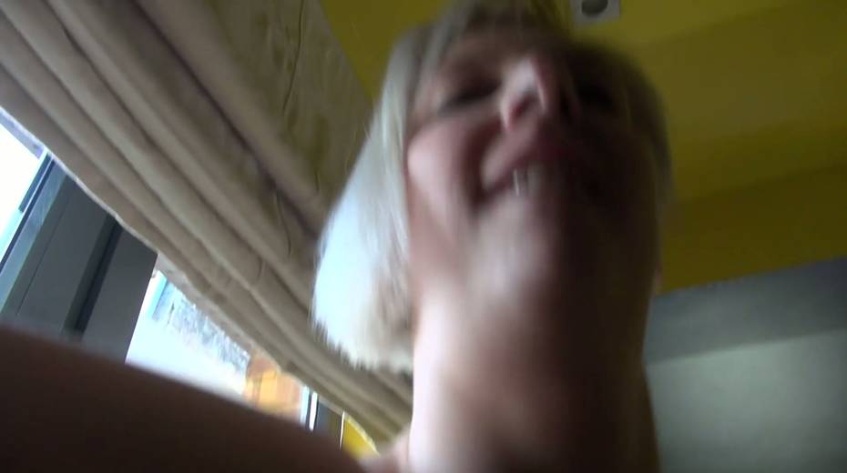 Blond hooker in stockings spreads legs wide open and shows pierced pussy