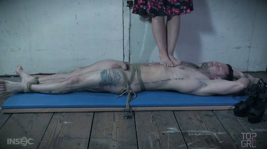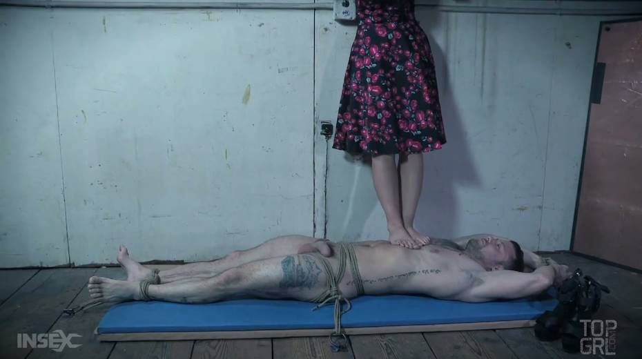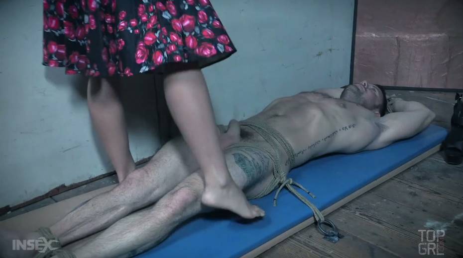 Perverted mistress London River punishes balls and dick of one kinky tied up man