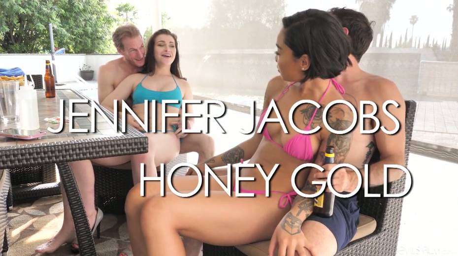 Black chick Honey Gold and white hooker Jennifer Jacobs are fucked by two studs