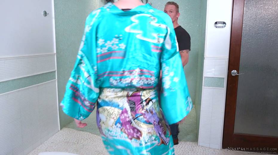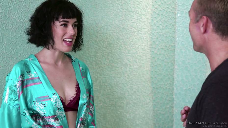 Attractive brunet masseuse Olive Glass gives a nuru massage to one tattooed man