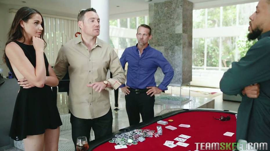 Three dudes fuck sexy brunette Avi Love right on the poker table