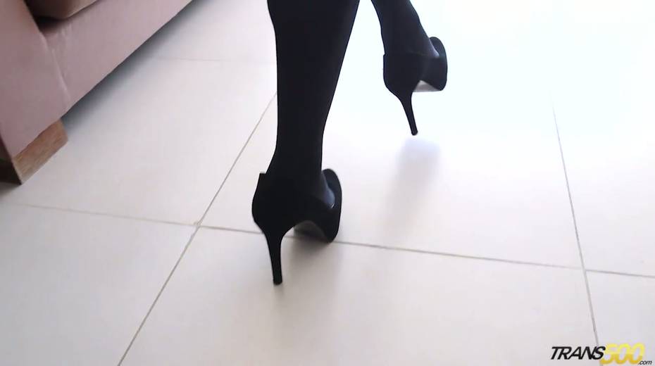 Slutty tranny in stockings and short skirt Tania Q jerks off her dick