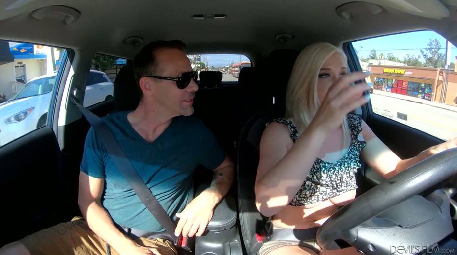 Sexy driver Emily Righ jerks off a dick in the car and gets her boobs fucked on the bed