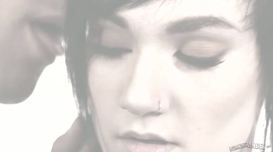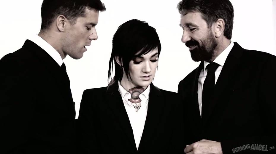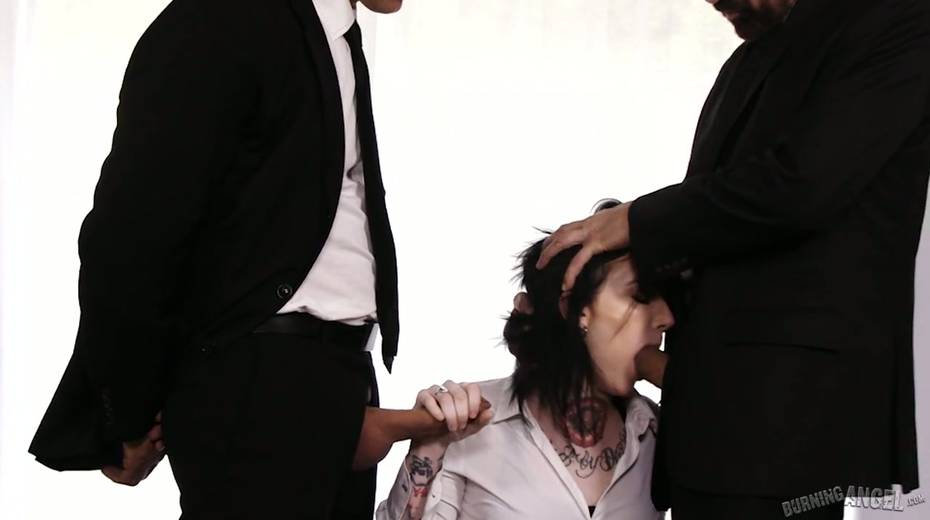 Tattooed goth chick Steve Holmes gets double penetrated for the first time