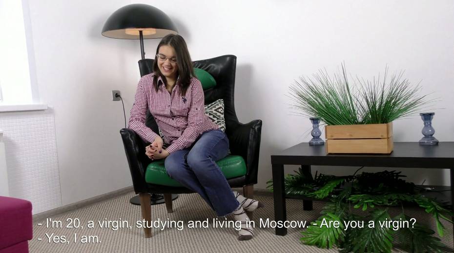 Nerdy 19 yo brunette Roza Esposito shows off her hairy virgin pussy