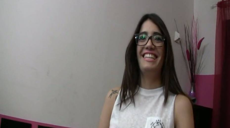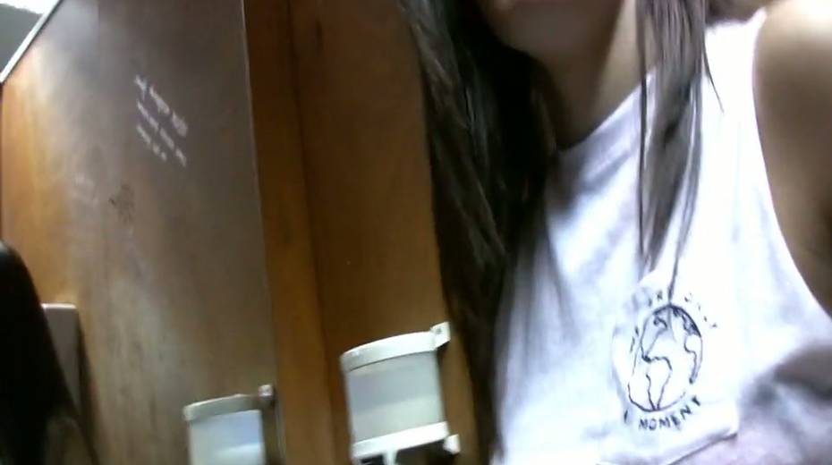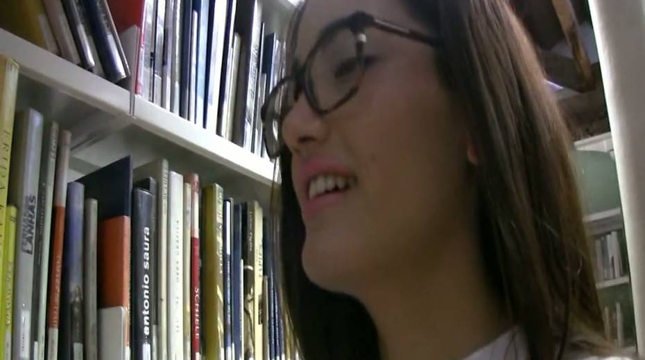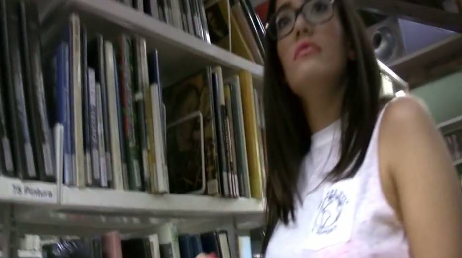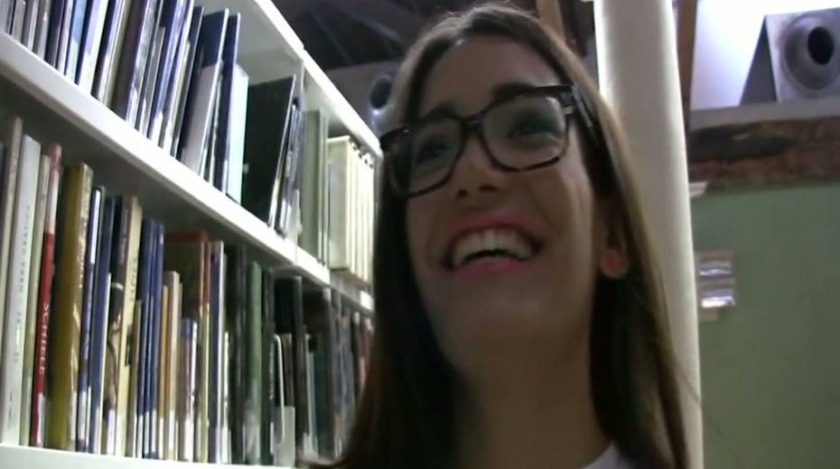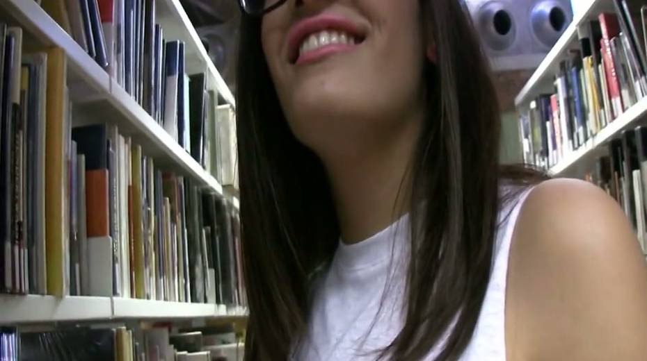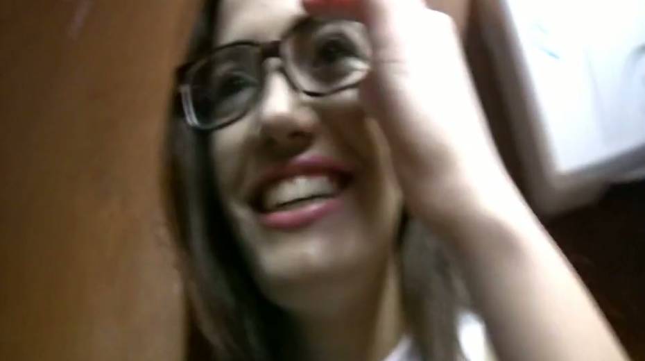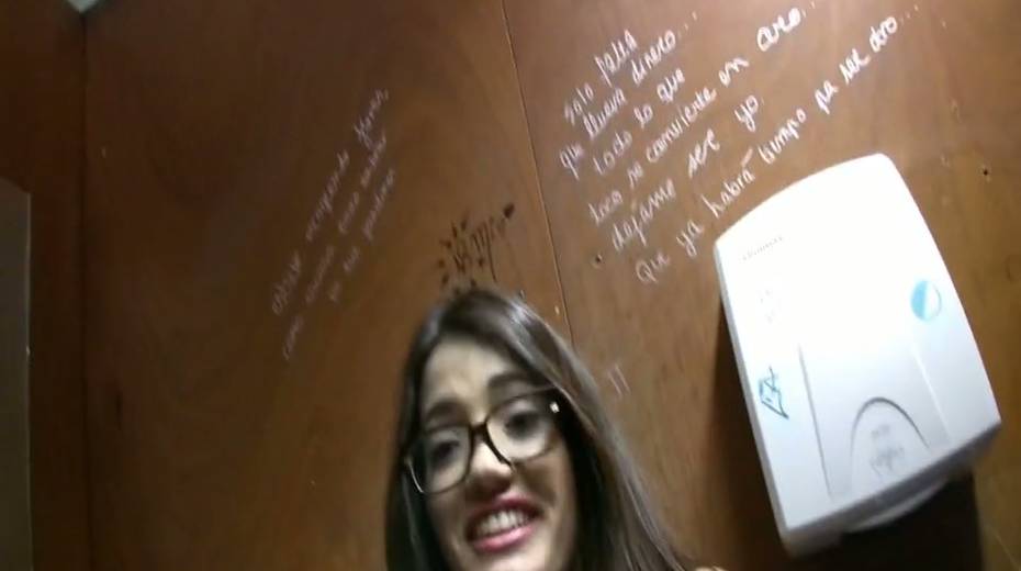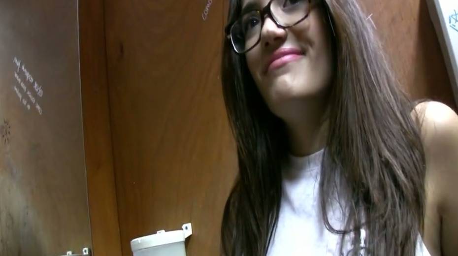 Nerdy brunette in glasses Penelope Cum sucks a dick in the toilet and gets messy facial