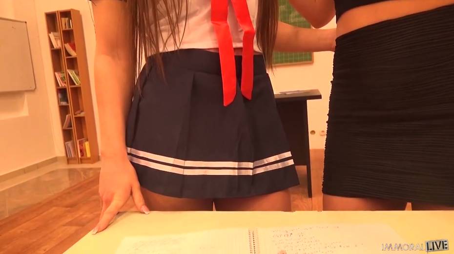 Horny teacher fucks two leggy and super sexy college babes