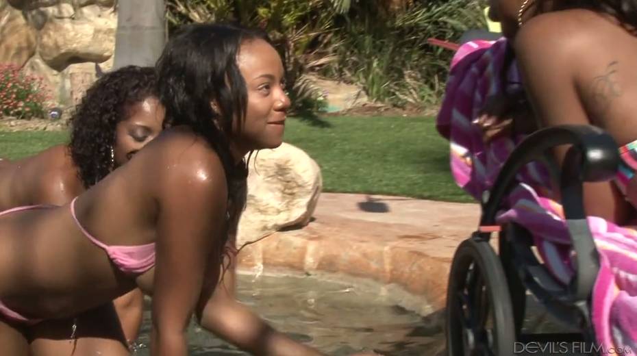 Captivating black babes and Yasmine De Leon arrange dirty lesbian orgy by the poolside