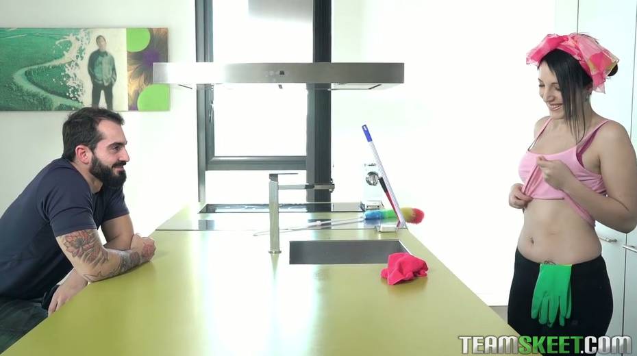 Adorable cleaning babe Liz Rainbow is polishing a hard dick