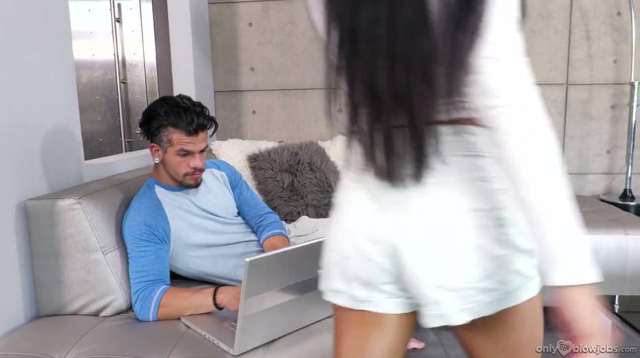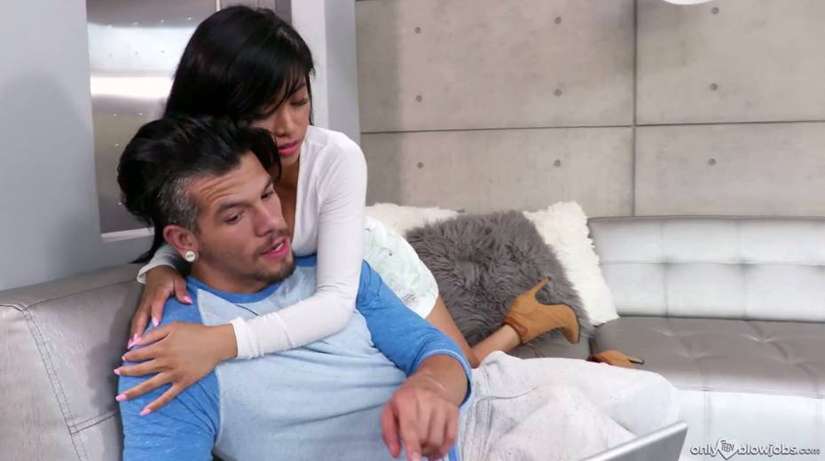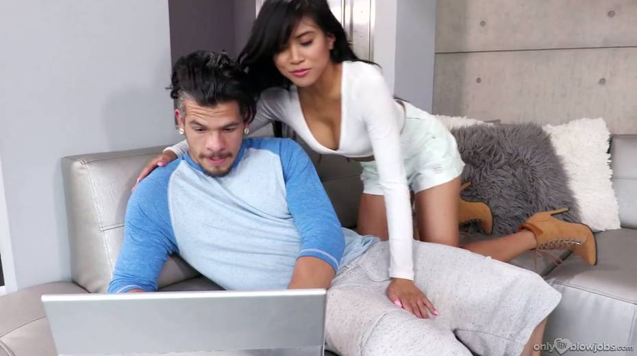 Adorable Asian babe Ember Snow licks and sucks a huge dick