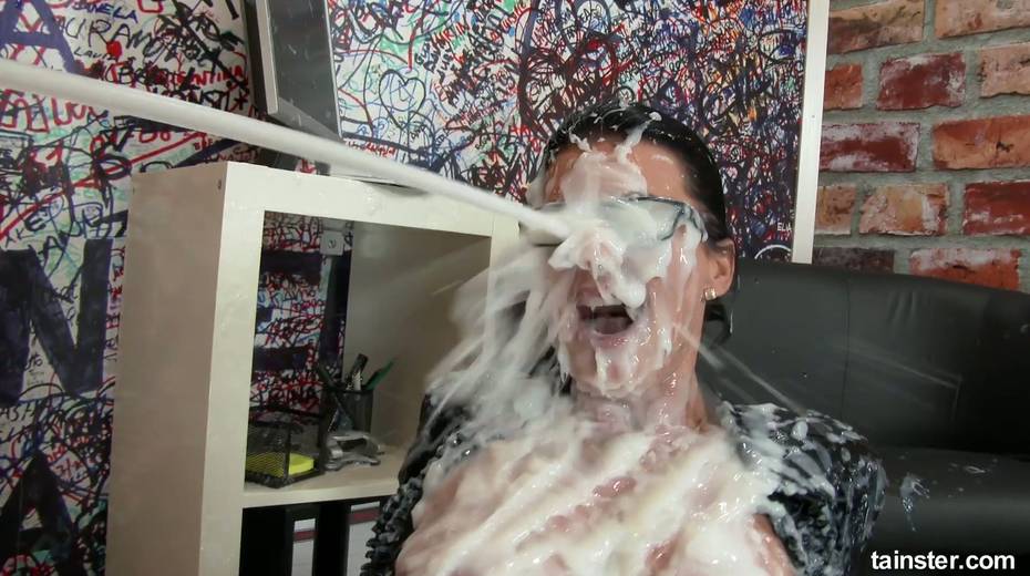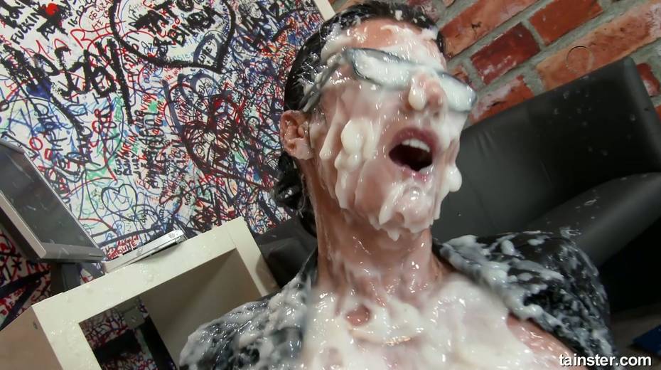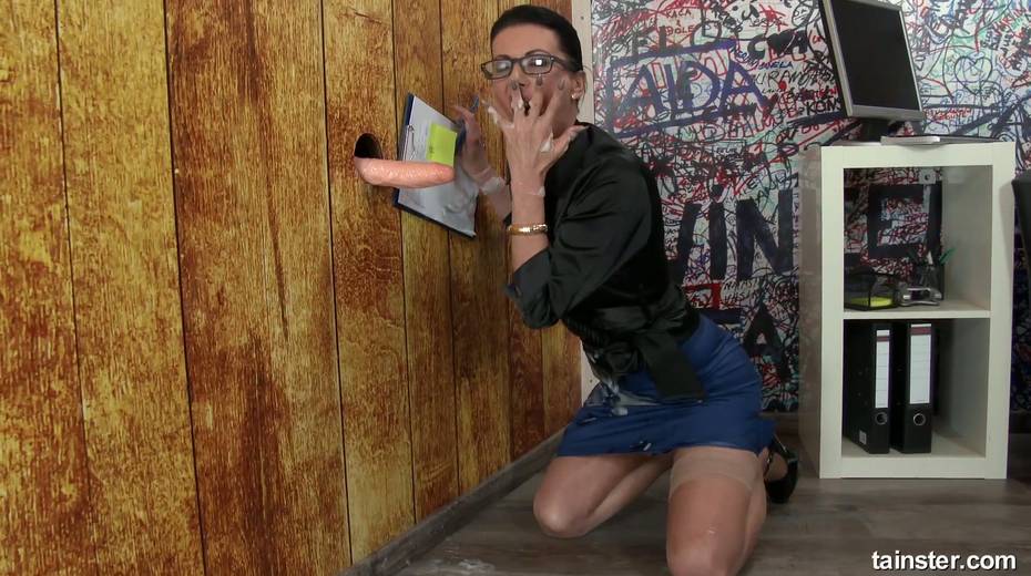 Nerdy secretary in glasses gets messy and dirty in the glory hole room