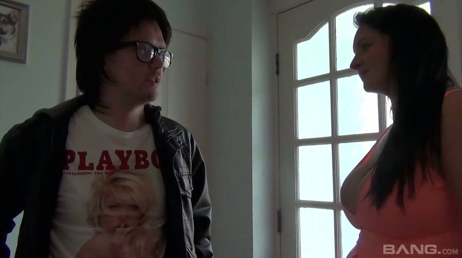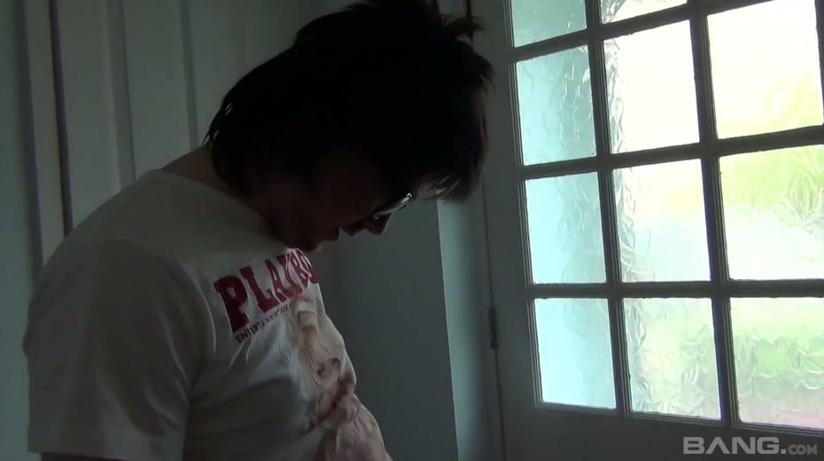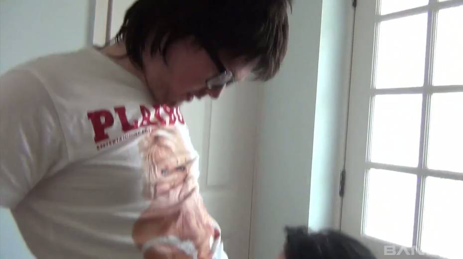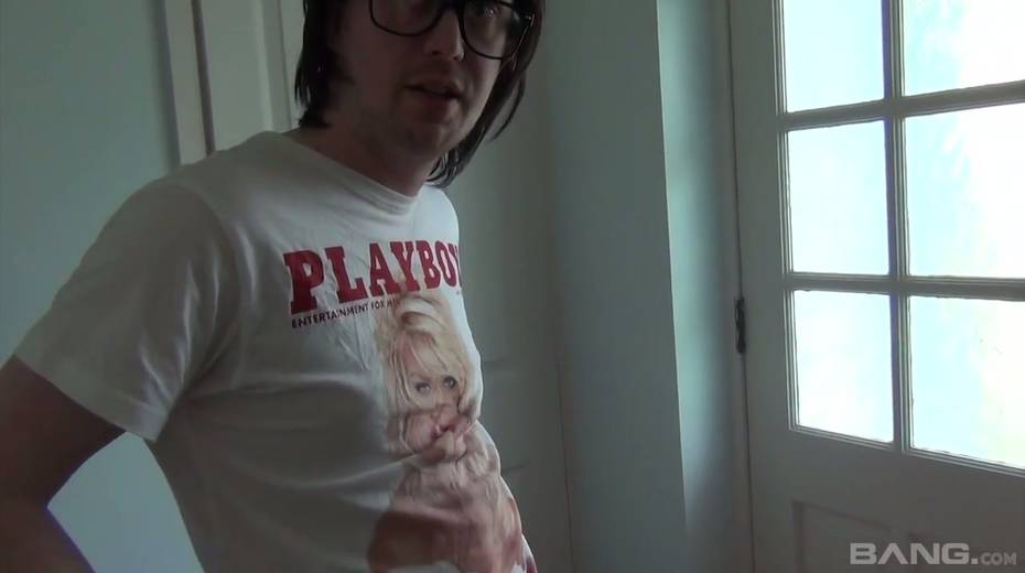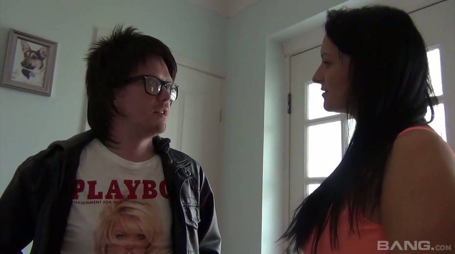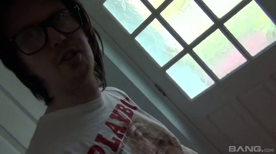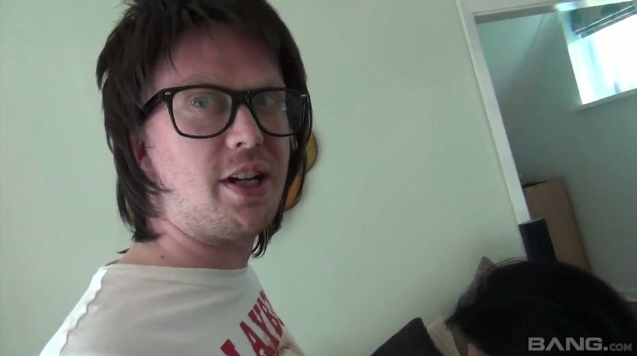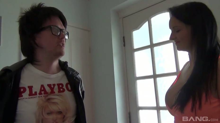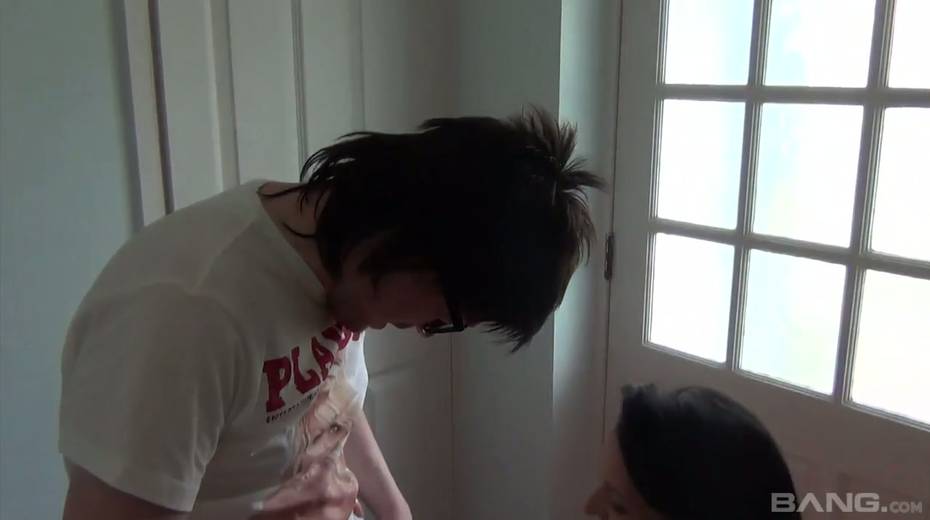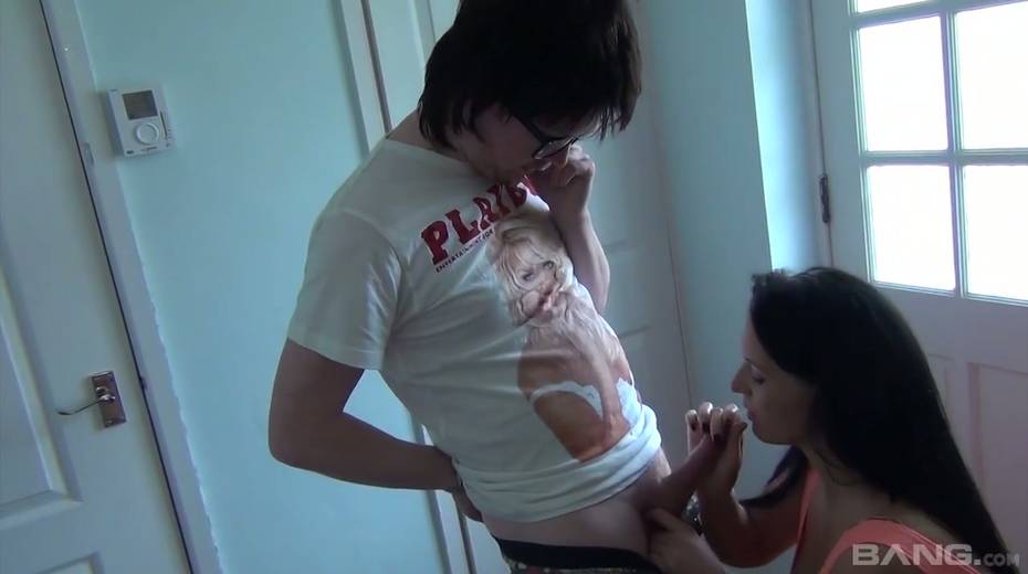 Greedy for cum brunette Devon Breeze gives a blowjob to one nerd in glasses