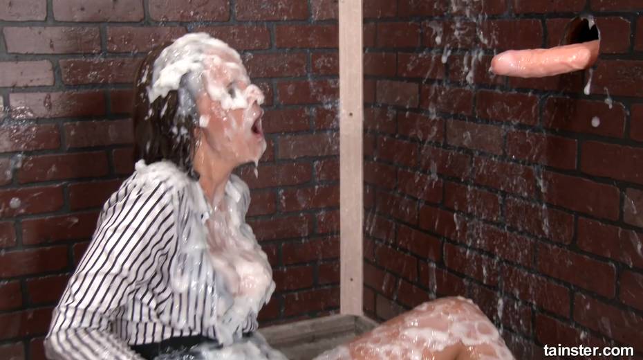 Trashy looking whore gets messy and dirty in the glory hole room