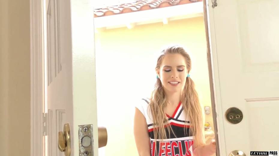 Small tittied cheerleader Lilly Ford gives a rimjob to her boyfriend