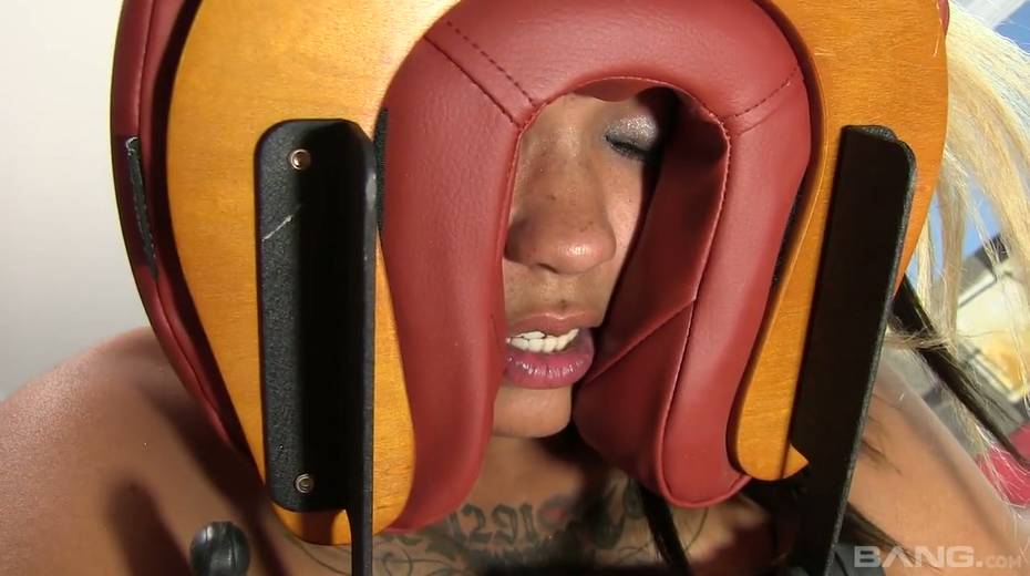 Ebony hottie with crazy tatts Mercedes Santos is fucked by white masseur