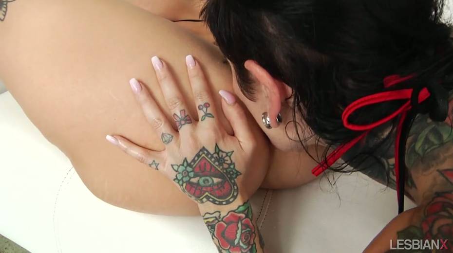 Tattooed bitch Joanna Angel fucks GF's pussy with a strapon