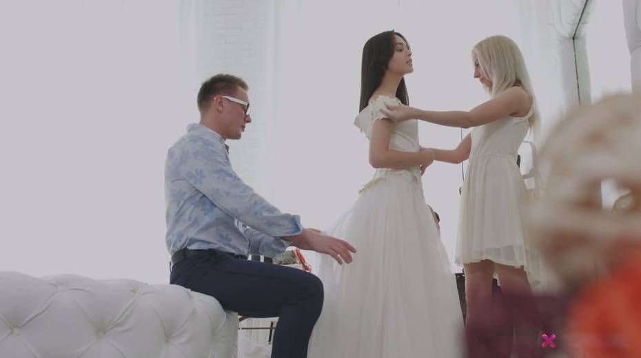 One dude fucks blonde Michelle Can and brunette and cums in their mouths