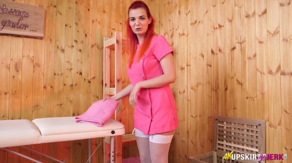 PAWG masseuse in short uniform and white stockings Dolly shows panties upskirt