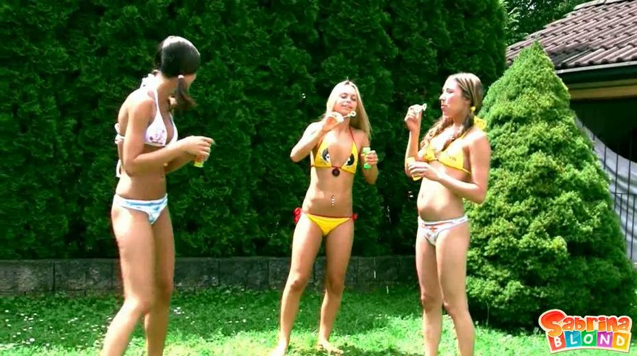 Three lesbian babes are masturbating yummy shaved pussies on the lawn