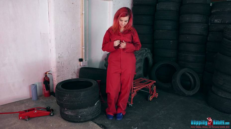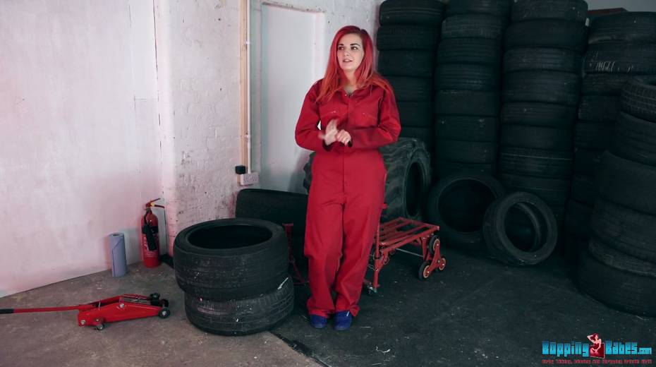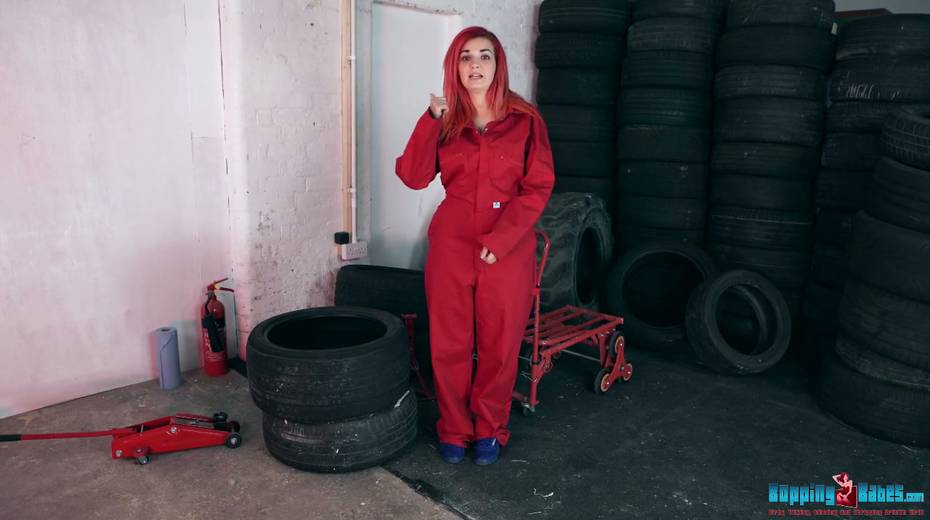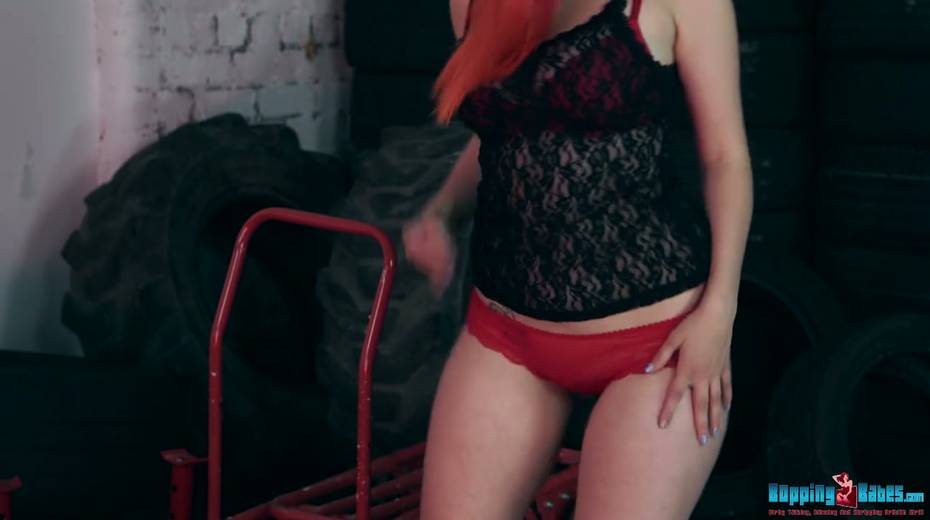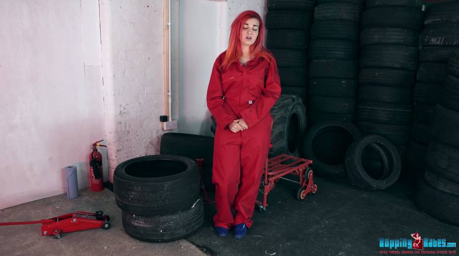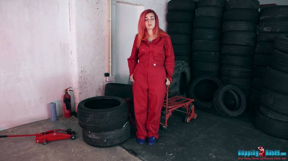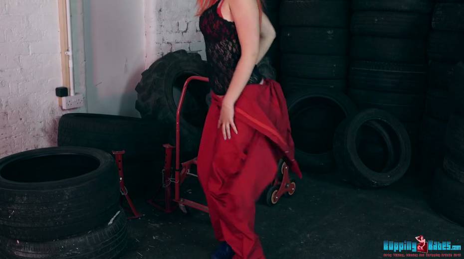 Red haired hooker Dolly shows striptease in the tire shop