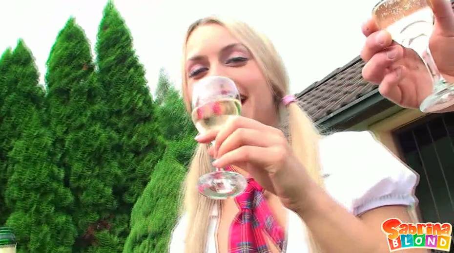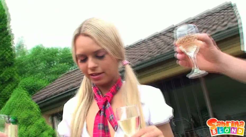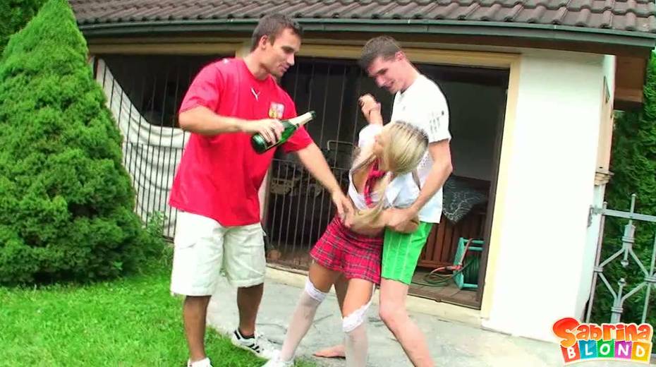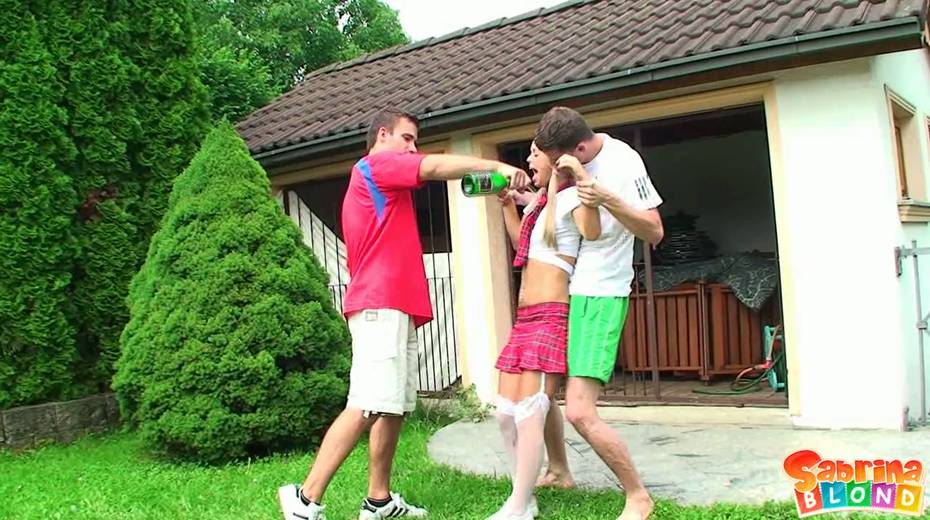 Two dudes fuck naughty pig tailed blond teen Sabrina Blond right on the lawn