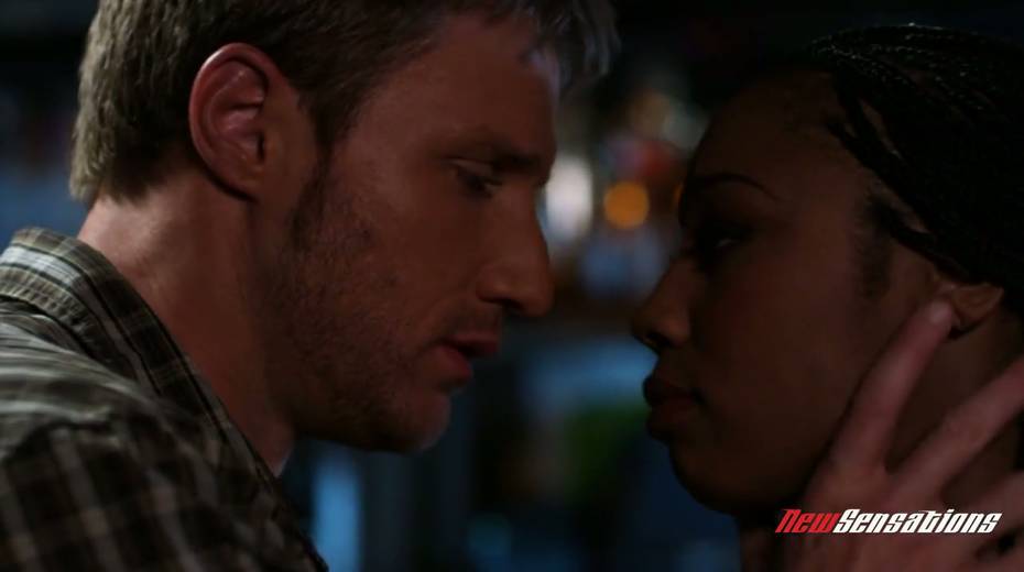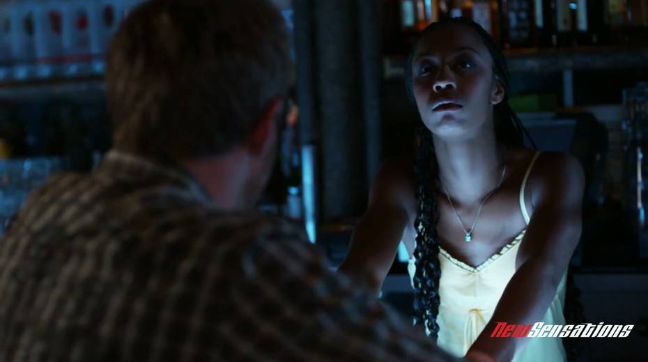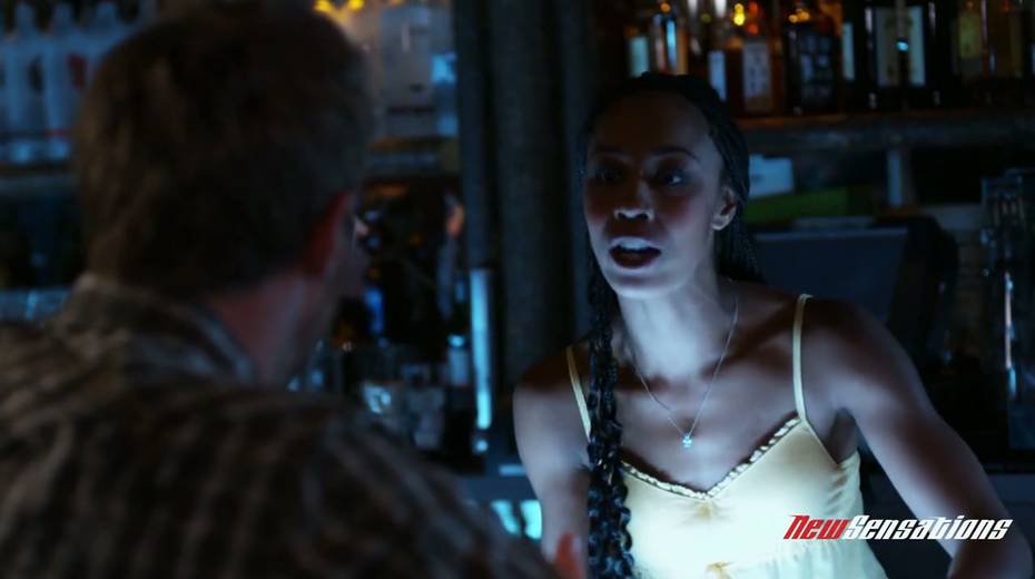 Lewd ebony bartender enjoys sucking a big white cock and balls