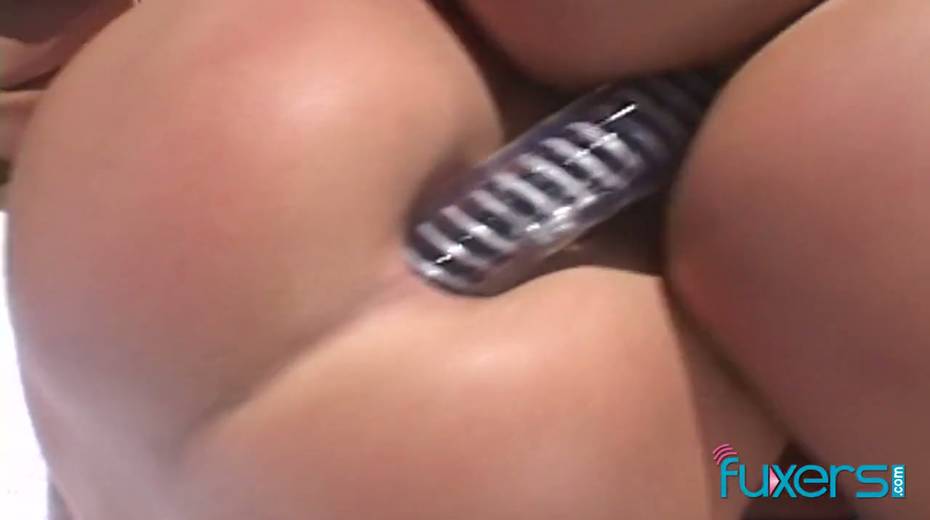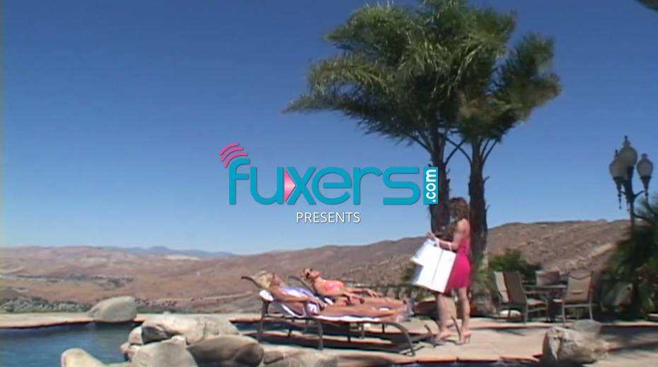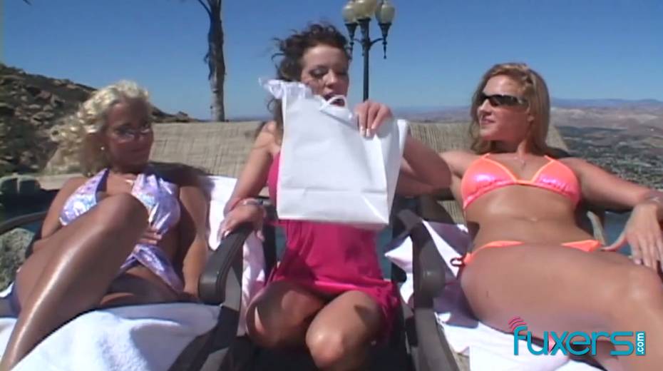 Three horny lesbians dildo fucking each others anal holes by the poolside