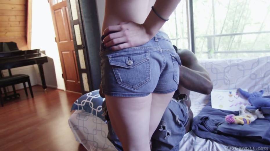 Pigtailed skinny chick Ember Stone gets her pussy blacked and stretched