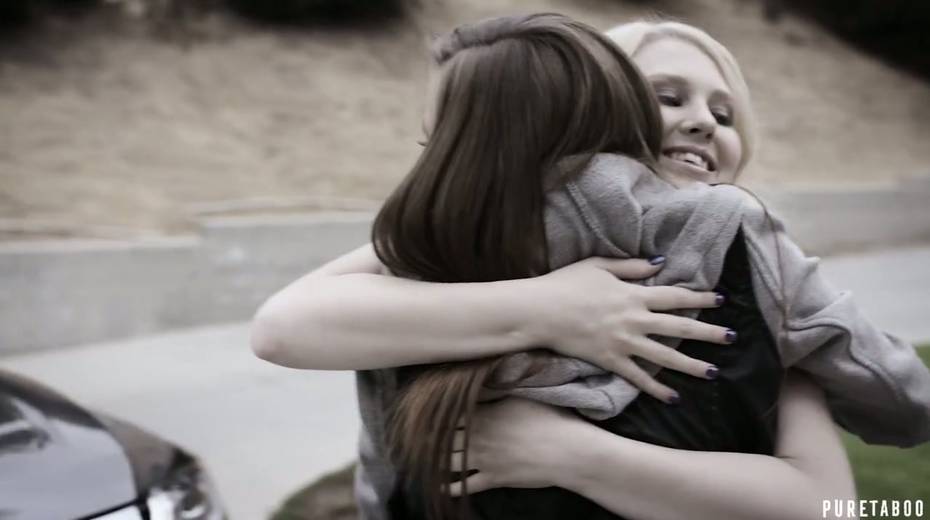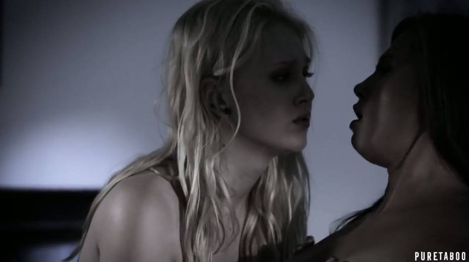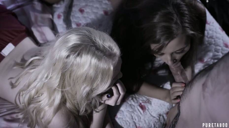 Two lesbian babes kiss each other while dude fucks their pussies