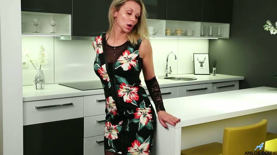 Stunning milf in sexy lingerie and stockings Queenie masturbates on the table