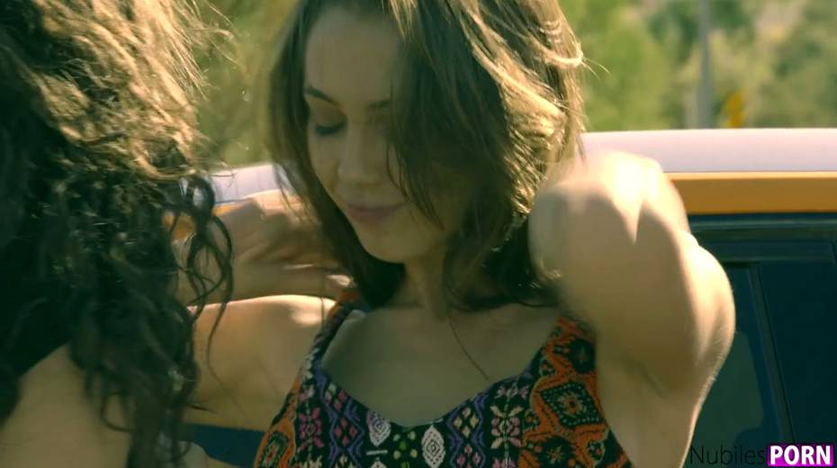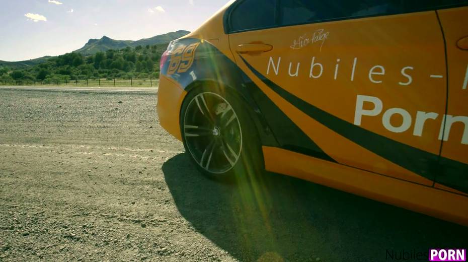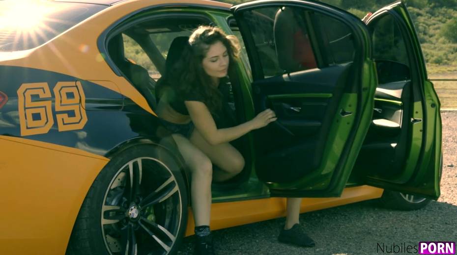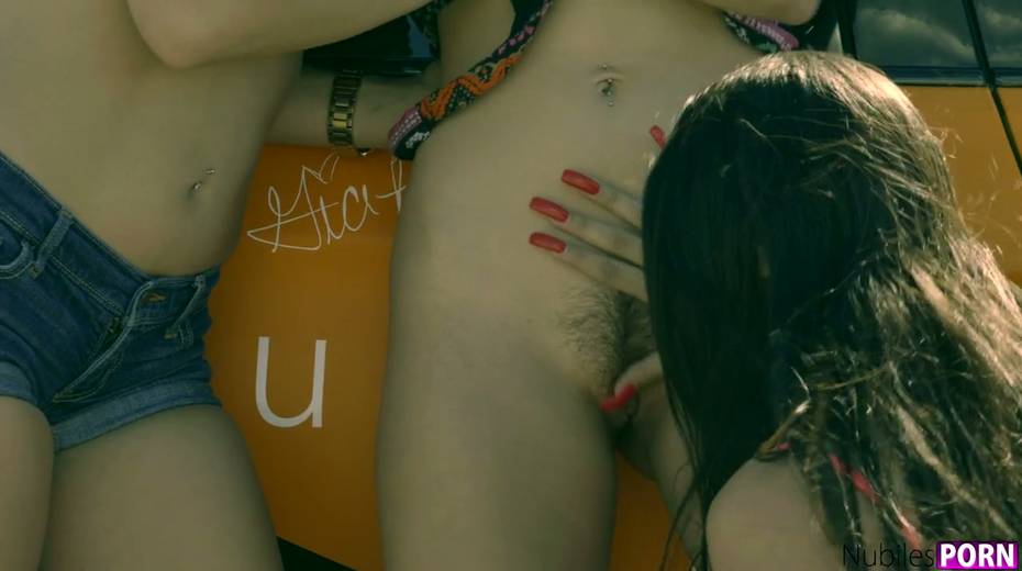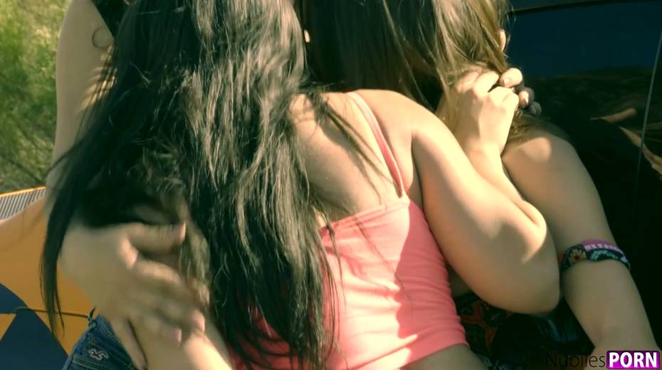 Three playful lesbians cuddle and fondle each other by the luxury car