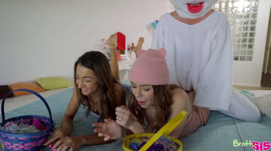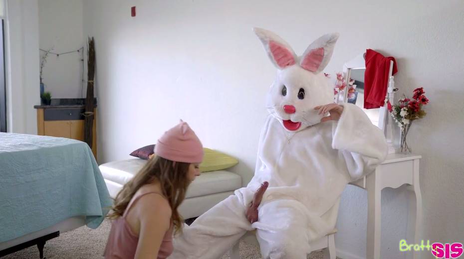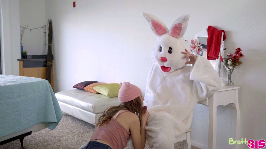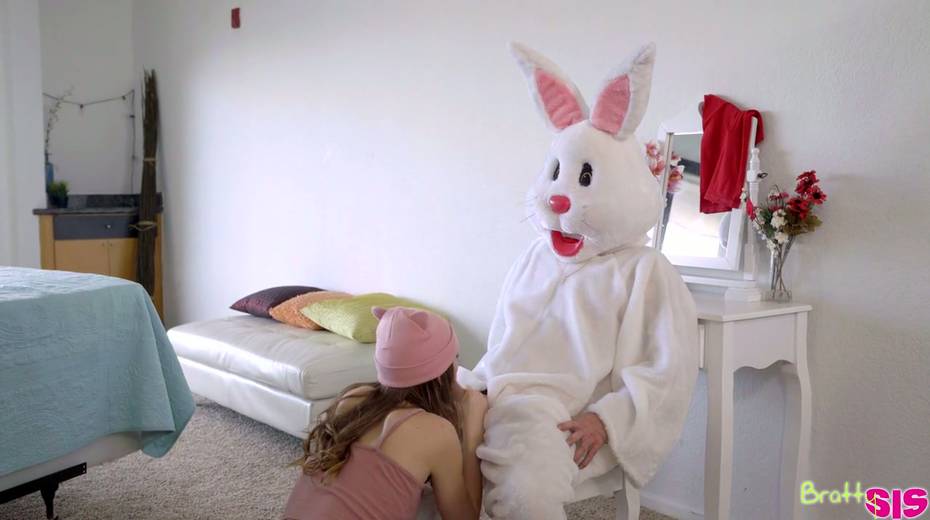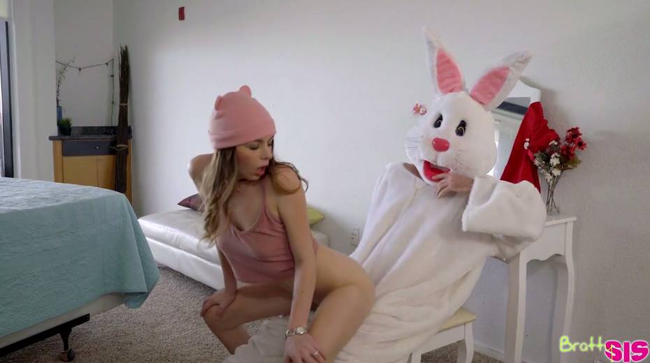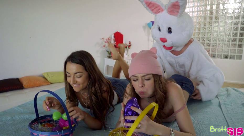 Pretty hot babes are fucked by step brother in funny Easter bunny costume