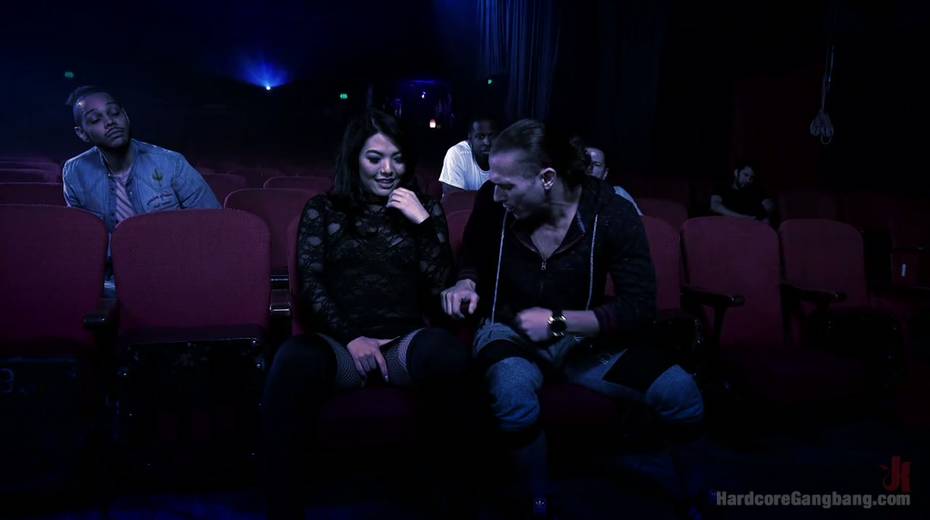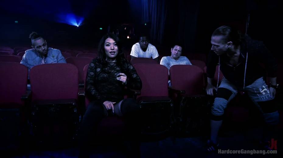 Slut in ripped body fishnets Nari Park gets double penetrated before bukkake scene