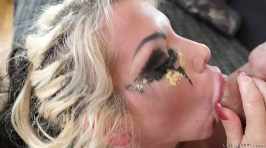 Trashy looking blond hooker Barbie Sins serves three dudes at the same time