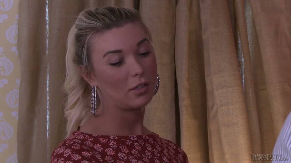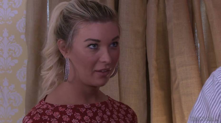 Blond tranny Aubrey Kate gives a blowjob and gets anal hole fucked