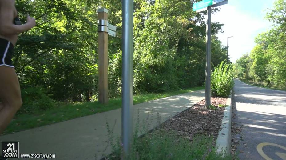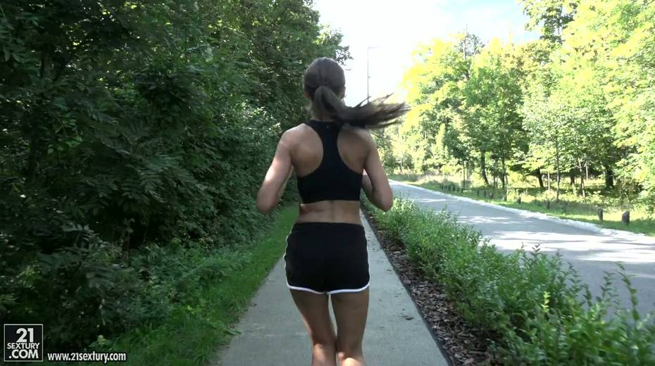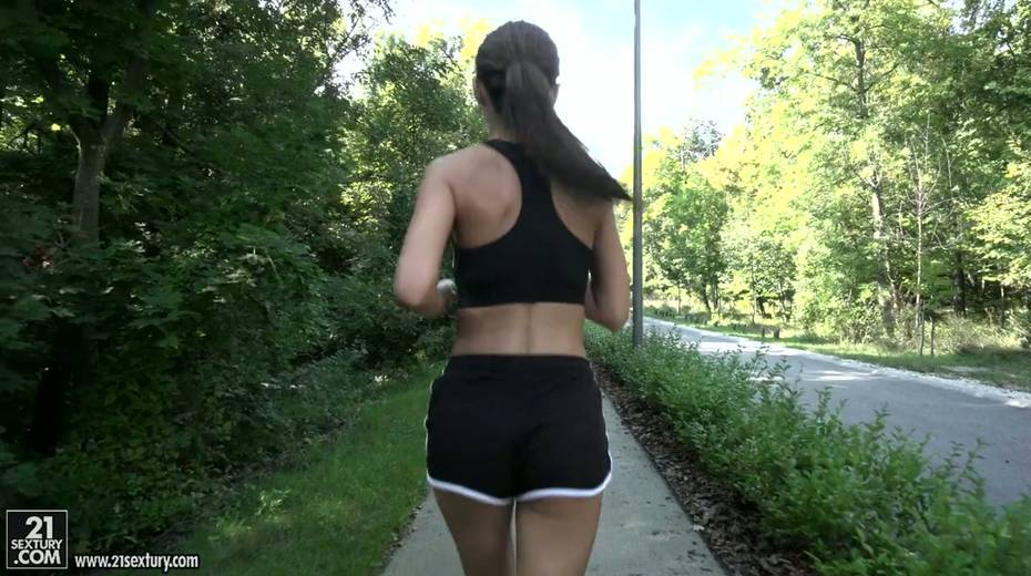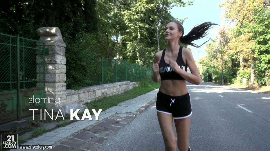 Jogging babe Tina Kay gives a blowjob and gets her ass hole rammed outdoor