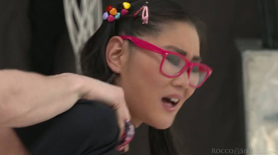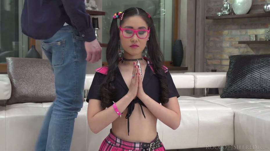Asian chick in pink glasses Katana gives her head and gets laid