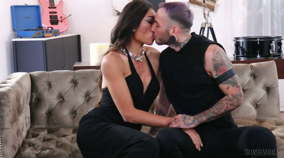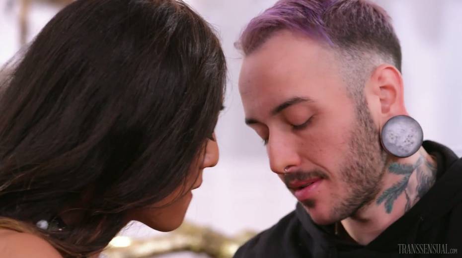 Exotic tranny Venus Lux fucks anus of tattooed dude and cums in his mouth