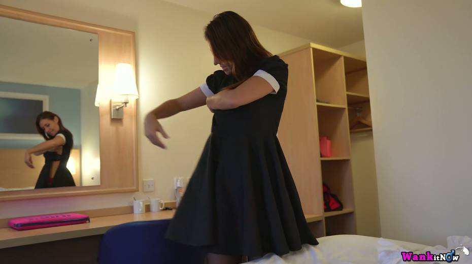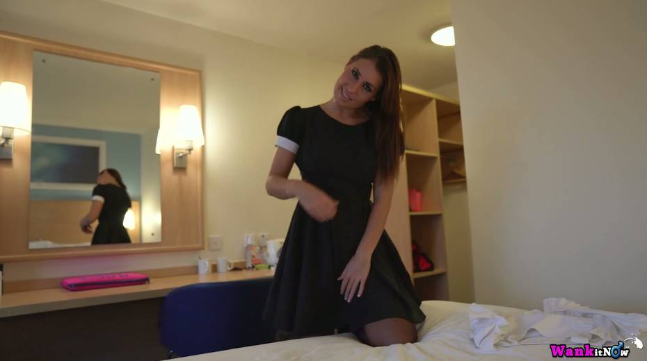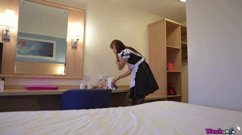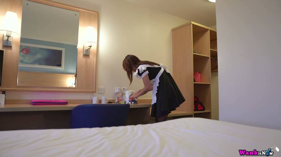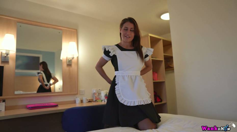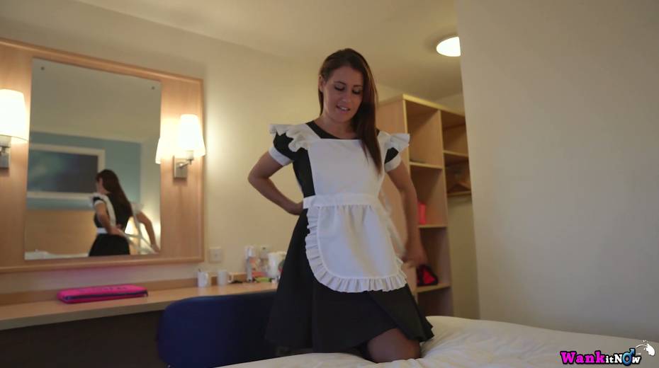 Young maid in sexy uniform Jess West is masturbating her wet pussy in the hotel room