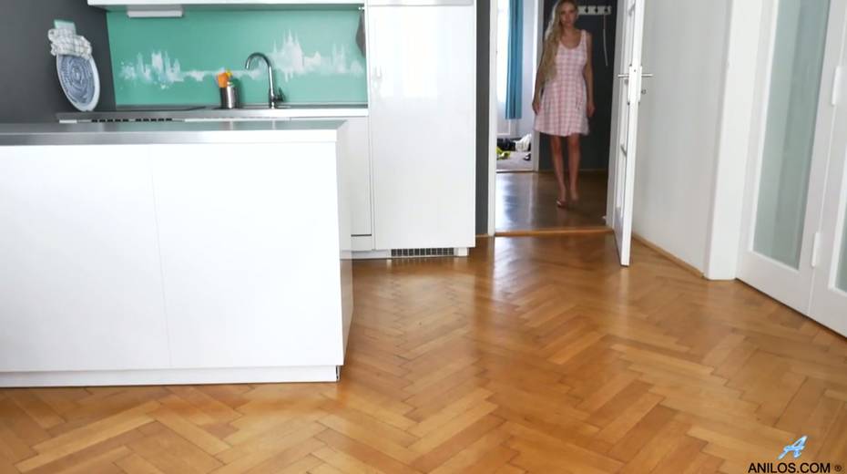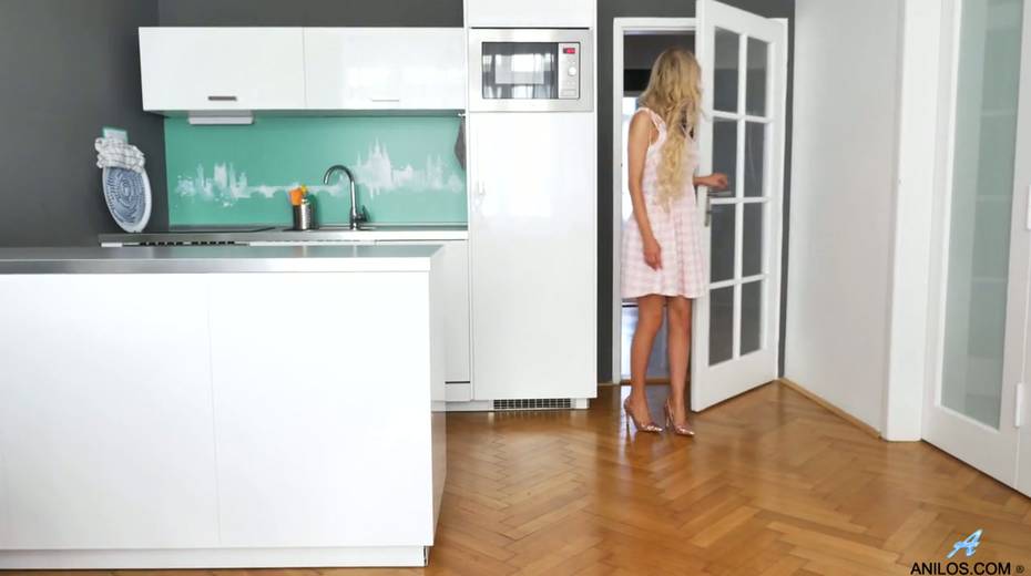 Knockout blond busty milf Florane Russell is toying her pussy on the table