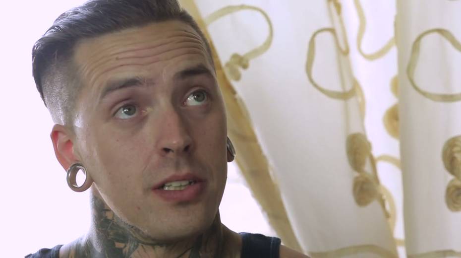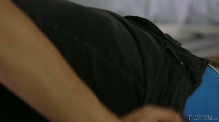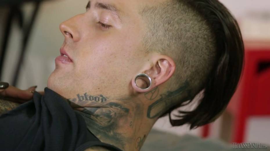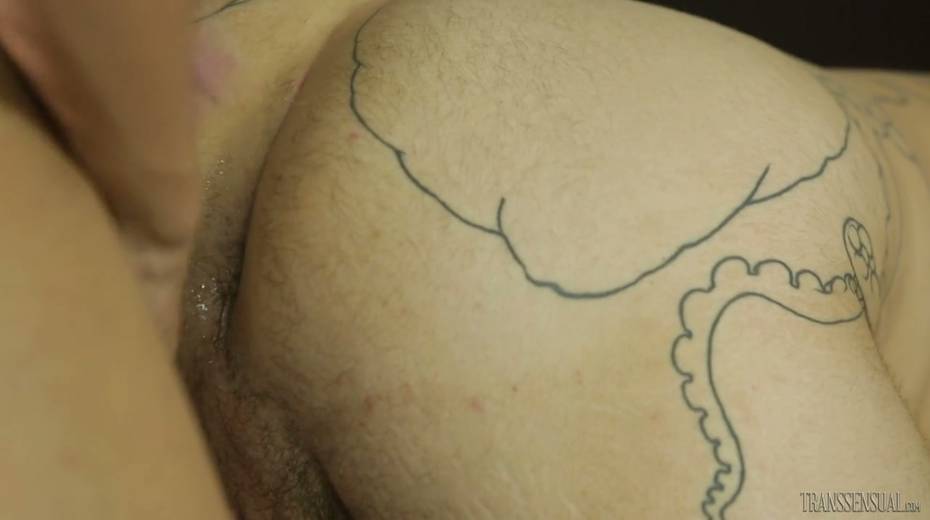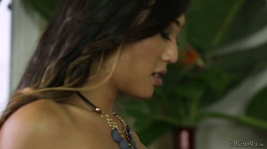 Asian T-girl Venus Lux fucks anus of one tattooed dude playing with his dick