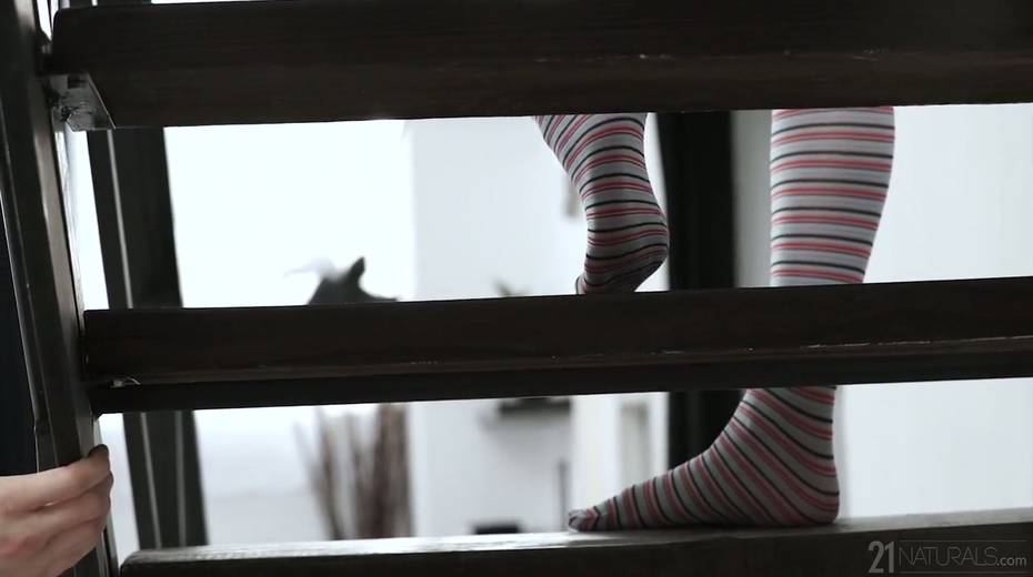 Beautiful girlfriend Sarah Cute gives footjob and gets fucked on the stairs