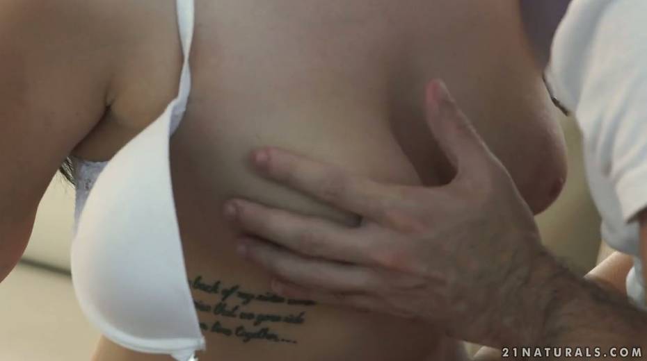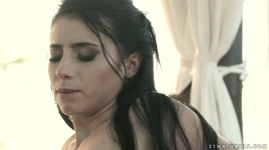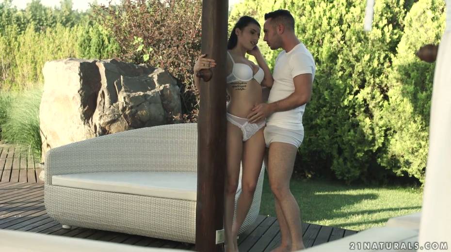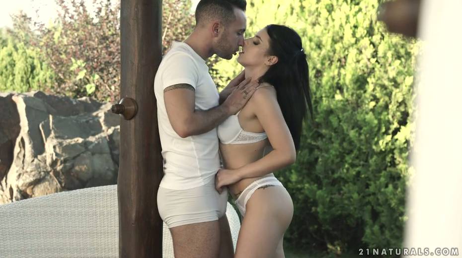 Libidinous brunette Nelly Kent gives a blowjob and enjoys making love outdoor