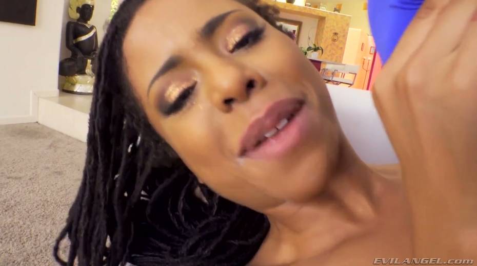 Ebony wench Kira Noir gets her anus stretched with a big white dick