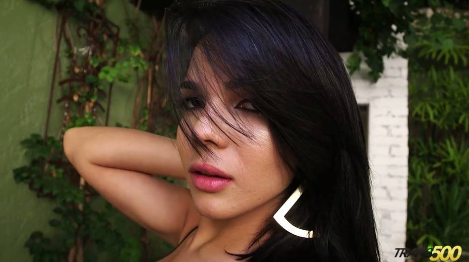 Big assed shemale Patricia Oliveira jerks off a dick and gets her anus nailed