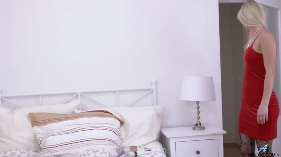 Stunning blonde in red dress and stockings Uma Zex stimulates cunt with a vibrator