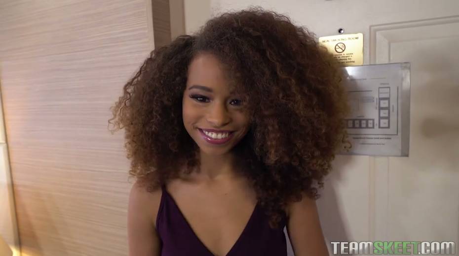 Skinny ebony babe with afro style curves Cecilia Lion is fucked by horny white fellow