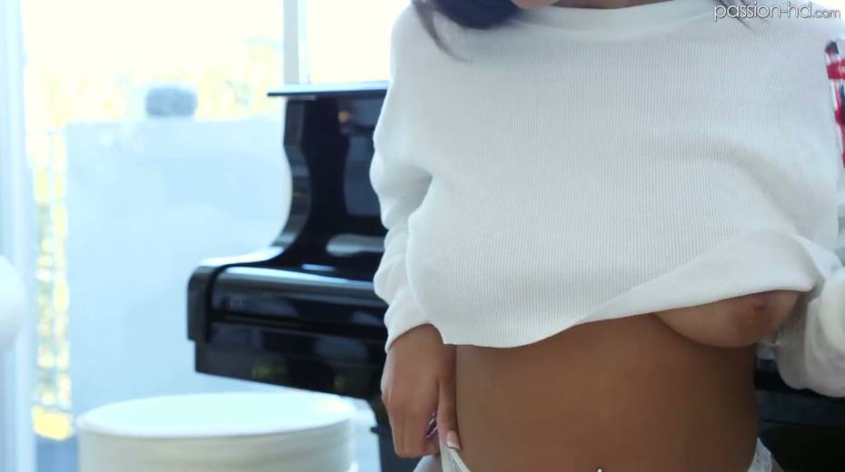 Full natural juggy babe Autumn Falls gives a titjob and gets facial