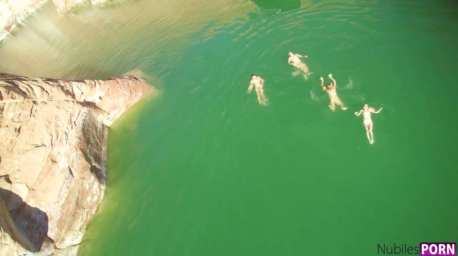 Two horny dudes fuck naughty slender girlfriends on the rocky shore